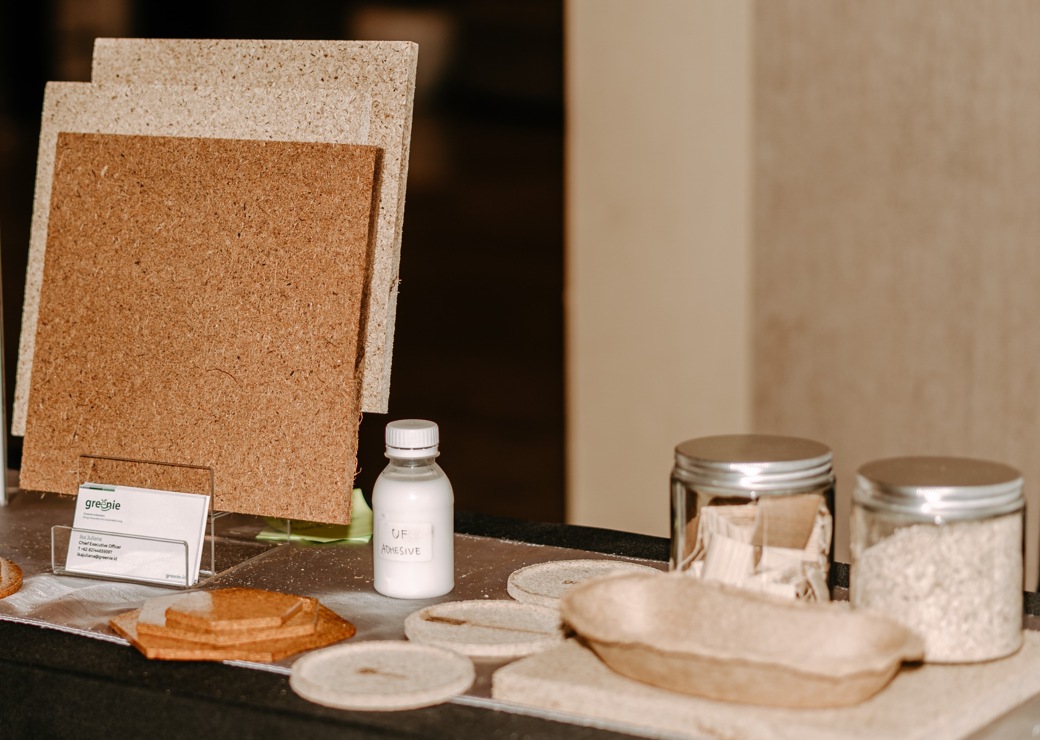 Greenie collects areca leaf sheath waste from local farmers and SMEs in Jambi and recycles that waste into sustainable natural particle board for the home furnishing industry. This non-timber-based material uses a low-emission adhesive combined with agricultural waste, supporting carbon emission reduction in furniture. Yet, adapting peat palm into quality furnishings wasn’t simple. The process, striving to rival conventional wood quality, demanded rigorous experimentation.